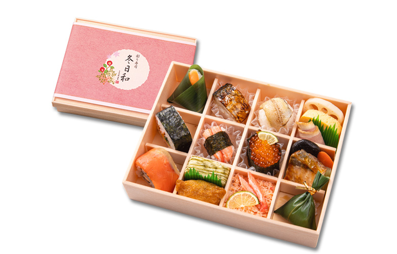 12の仕切りに冬の味覚を少しずつ。季節の寿司弁当。